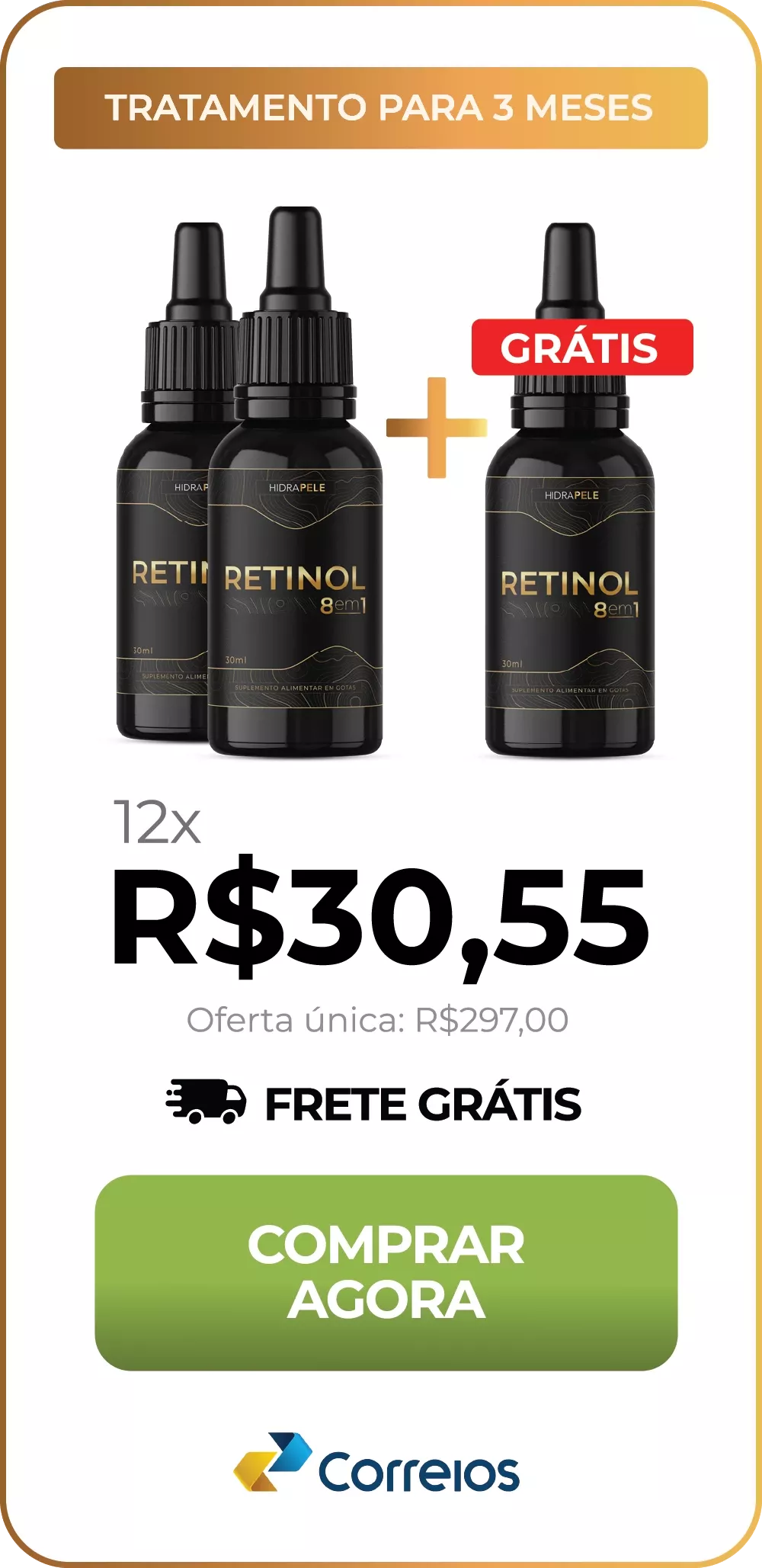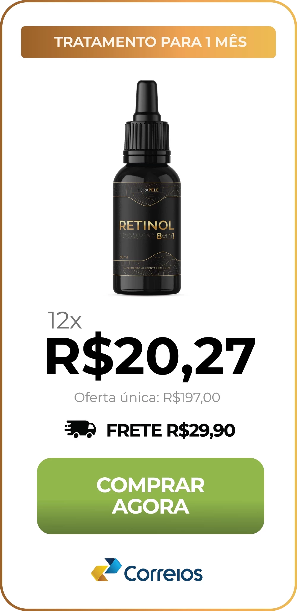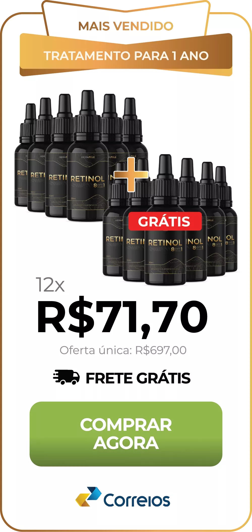 Basta escolher o kit que mais combina com você. Retinol 8 em 1 pode ser pago a vista, através de boleto bancário, ou através de cartão de crédito parcelado em até 12x.